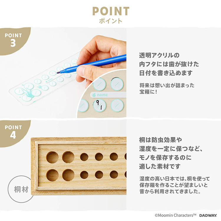 ムーミンベビー 桐箱乳歯ケース ムーミンファミリー NZMB007224300/その他/ブランド:MOOMIN BABY(ムーミンベビー)/【発売元、製造元、輸入元又は販売元】ダッドウェイ/【ムーミンベビー 桐箱乳歯ケース ムーミンファミリー NZMB007224300の商品詳細】●お子さまの乳歯を大切に保管 。●歯を20本収納可能。●桐は防虫効果や湿度を一定に保つなどの保管に適した特性を持ちます。●大小の穴に、前歯と奥歯を分けて入れられます。●透明アクリルの内フタに油性ペンで歯の抜けた日を記入できます。●ムーミンを迎えるムーミンパパとムーミンママのアートを使用。●お子さまの成長を喜ぶ気持ちを表現したデザインです。