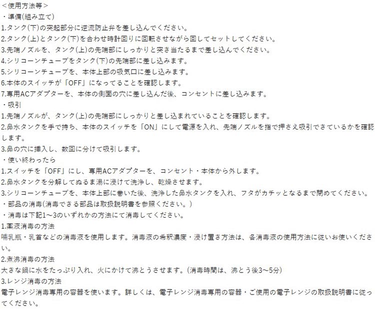 ・鼻腔の鼻汁の吸引以外の目的で、本品を使用しないでください。