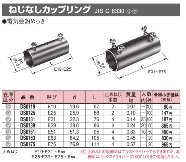 ■説明:ねじなし電線管相互の接続に使用します。止めねじの仮締めはプラスドライバーでもできますが、本締めはボックスドライバー(DS0010)をご使用ください。