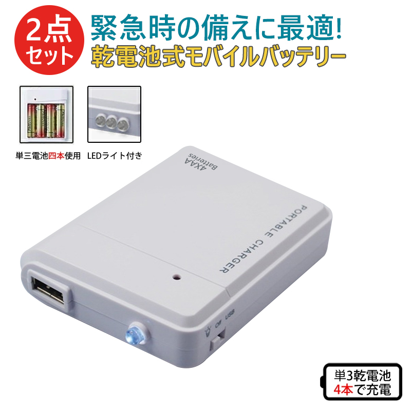 モバイルバッテリー 電池式【2点セット】 充電器 スマホ 携帯用 iPhone 持ち運び アンドロイド 充電器 単3 防災グッズ 非常用 LEDライト