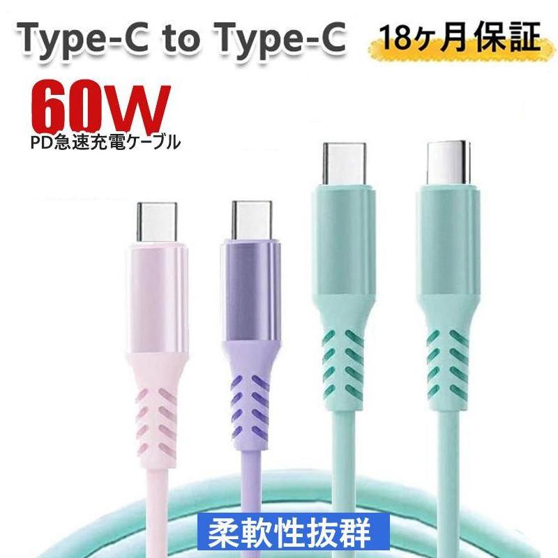 タイプC ケーブル Type C to Type C ケーブル PD対応 60W 急速充電 データ転送 絡まない 柔軟性 シリコンケーブル Android iphone 15 スマホ 1m 2m 18ヶ月保証