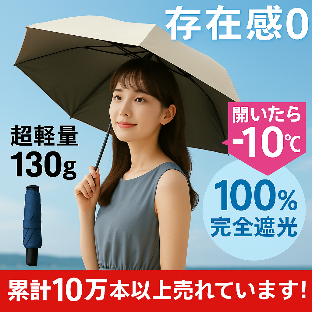 UVカット率100%、UPF50+の高い紫外線防止力で、真夏の直射日光からお肌を守ります。厳しい暑さ対策に最適な日傘です。