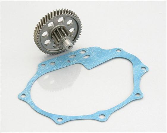 ギア比を小さくすることにより、最高速がアップします。最高速の伸びがいまひとつという場合に、組み込むと効果的です。コーナーの少ないスピード重視のコースに向いています。また、あくまでも比率を変更するパーツですので、最高速を高めた分、バランス補正のためにボアアップ等やクラッチセンタースプリングの装着で低中速のトルクアップを図りましょう。