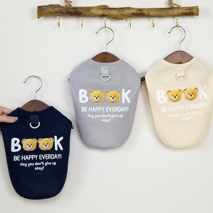かわいらしいくまのワッペンがポイントのペット用ニットタンクトップです。やさしいメッセージ「BE HAPPY EVERYDAY!」がプリントされ、毎日をハッピーに過ごせそうなデザイン。柔らかなニット素材で、小型犬にぴったりの暖かく快適な着心地を提供します。シンプルながら存在感があり、室内でもお散歩でも活躍するアイテムです。