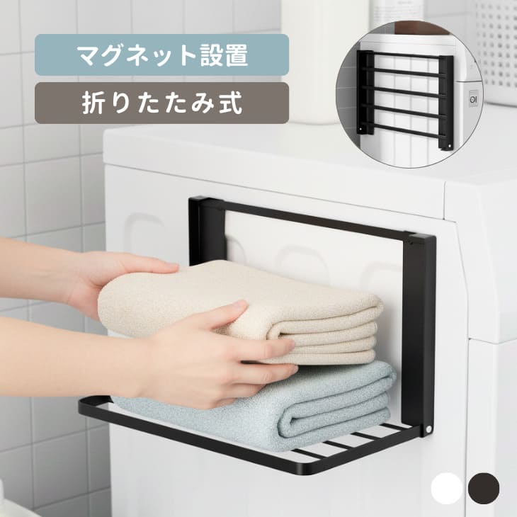 - 洗濯機の横にピタッと貼るだけで使える、強力マグネット式の折りたたみ棚です。タオルや洗剤、ランドリーバスケットなどの一時置きスペースを作り、洗濯まわりをスッキリ整頓。使うときだけサッと引き出し、使わないときは約4cmの薄さに折りたたんで邪魔になりません。シンプルなデザインでどんなインテリアにもなじみます。