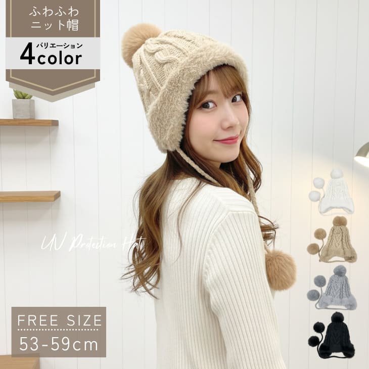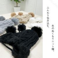 ふわふわのニット帽に bigなファー風ポンポンが2つ揺れる、冬のおしゃれと保温を両立するアイテムです。 Cable編みと耳当てで暖かさをキープし、頭周り53〜59cmのフリーサイズ。4カラー展開で、カジュアルからガーリーまで幅広いコーデにマッチします。