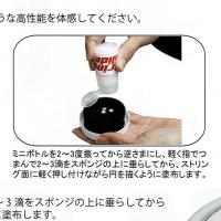 ●ミ二ボトルを2〜3度振ってから逆さまにし、軽く指でつまんで2〜3滴をスポンジの上に乗らしてから、ストリング面に軽く押し付けながら円を描くように塗布します。