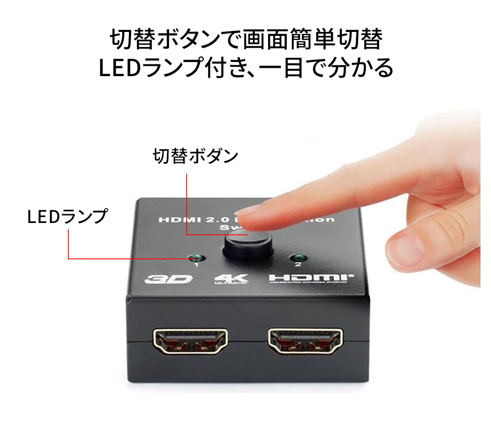 - 切替ボタンを押すだけで画面簡単切替。LEDランプ付き、一目で分かる。