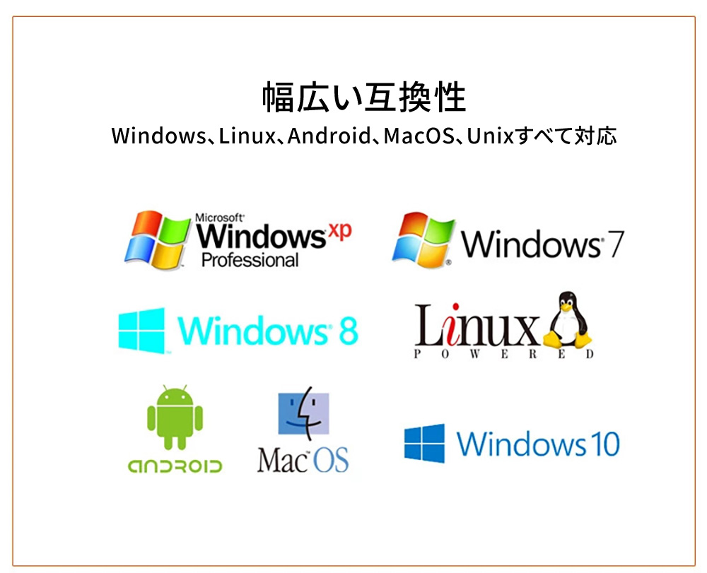 - 幅広い互換性。Windows、Linux、Android、MacOS、Unixシステムすべて対応。