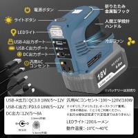 主な機能・特徴- マキタ18Vバッテリーがポータブル電源に変身!ノートパソコン、電球、ポータブル扇風機など低消費電力の家電製品(180W程度まで)を使える。