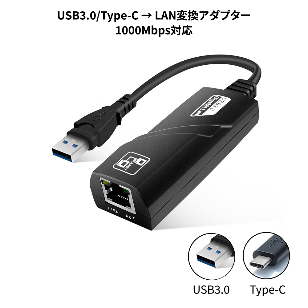 USB3.0/Type-c to LAN変換アダプター Gigabit 10/100/1000Mbps 有線LAN 高速データ通信