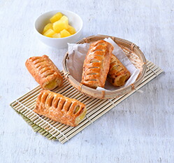 甘酸っぱくジューシーなパイナップルの果肉とカスタードのロールパイ。