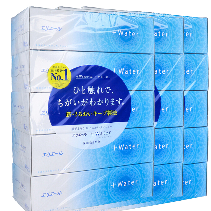| 注意事項 | 【注意】 ・エリエール+Waterは、ウエットティシューではありません。 ・保湿成分グリセリンを配合。※ティシューのほのかな甘みはグリセリンに由来するものです。 ・メガネを拭くと保湿剤でくもりますが、水洗いでとれます。 ・高温の場所、乾燥した場所や湿度の高い場所での保管は避けてください。 ・パルプ100%でつくられています。 ・蛍光塗料は使用しておりません。 ・トイレの詰まりを防止するために、水洗トイレに流さないでください。 ・ティシューの青い色は枚数確認の目印につけた食用色素です。ご安心ください。 ・においの強い物の側に保管すると、においが移ることがありますのでご注意ください。 |
