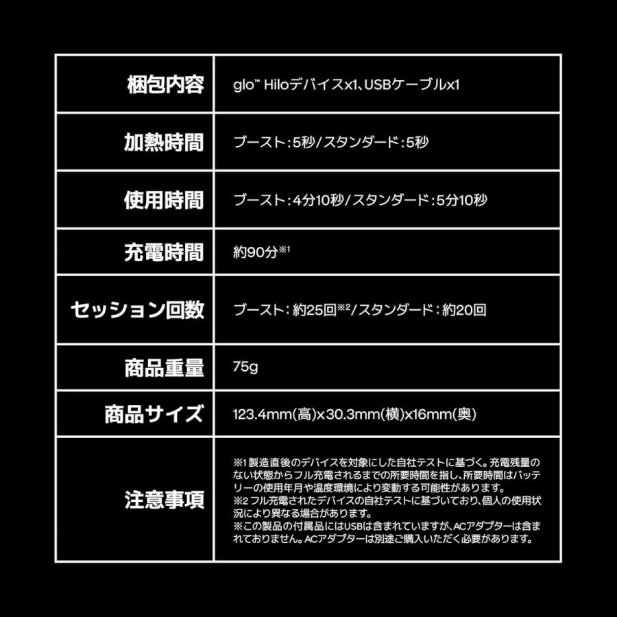 ● glo(TM) Hiloの特長 ・加熱時間わずか5秒を実現した、TurboStart (TM)テクノロジー。 ・EasyView(TM)スクリーンで、操作を直感的に。
