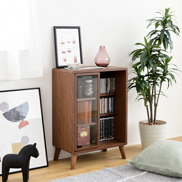 収納するものから設計されたデザインだから、コンパクトでも機能的。奥に収納したものもさっと取り出せる便利なスライドタイプの収納ラック。奥は本や参考書などに、手前のガラス扉収納はお気に入りの小物や写真などの収納に。丸みのある北欧風のデザインはとてもおしゃれで、ひとり暮らしのお部屋にもぴったりです。