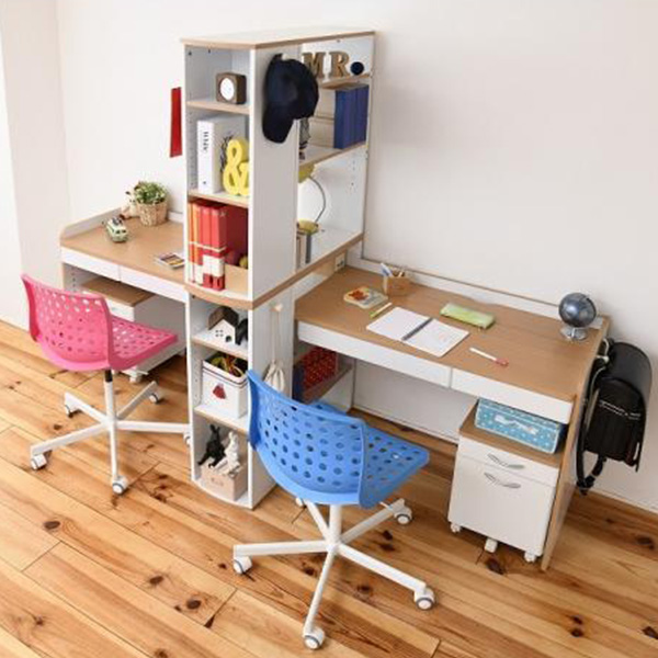 ツインデスクと言えばジュニアデスクのロングセラー。高さが11段階可変で、成長に応じて調節可能。横並びにも向い合わせにも、バラバラでも使えるので、兄弟・姉妹だけでなく、親子、SOHOにも使えます。A4ファイルの入るチェストセットで、ラックやデスク引出しと合わせて収納力も抜群。便利なフックも6つ付属!