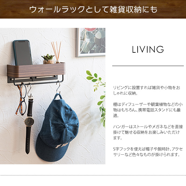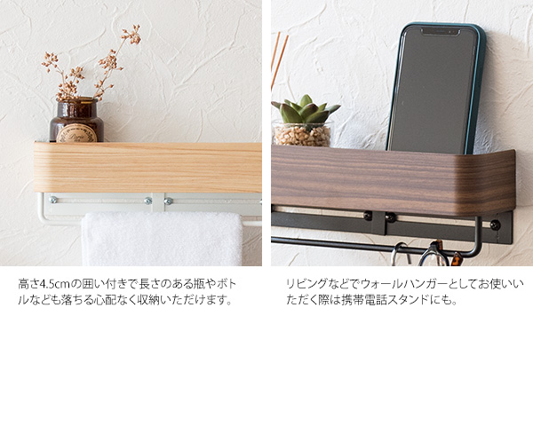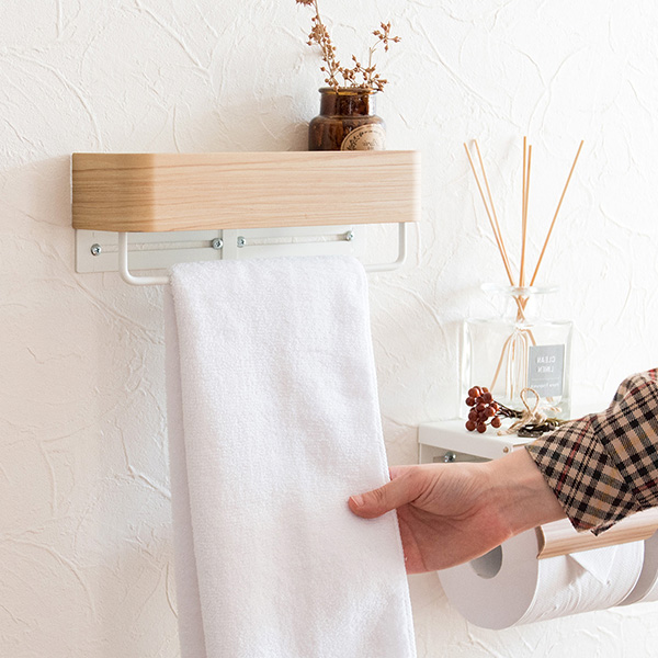 フェイスタオルを半分に折って掛けるのに丁度良いコンパクトサイズでハンガーの上にはディフューザーやボトルなどを収納できる便利な棚付き。