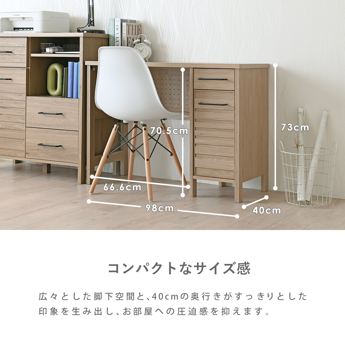 広々とした脚下空間と、40cmの奥行きがすっきりとした印象を生み出し、お部屋の圧迫感を抑えます。