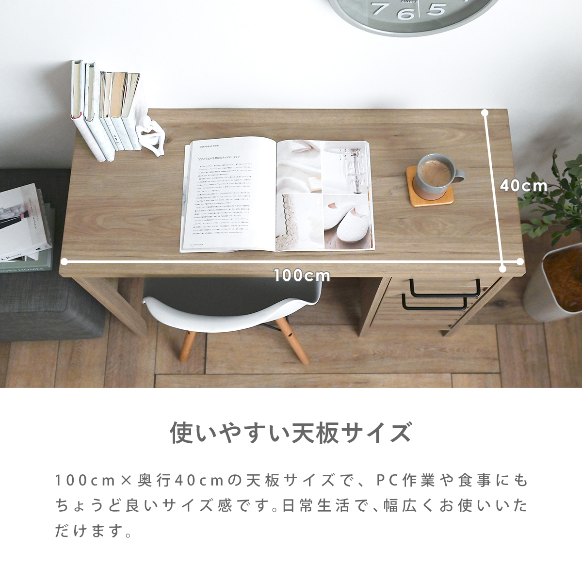 幅100cmのコンパクトサイズは一人暮らしやワンルームにも取り入れやすく、ノートパソコンを広げての作業にもぴったり。