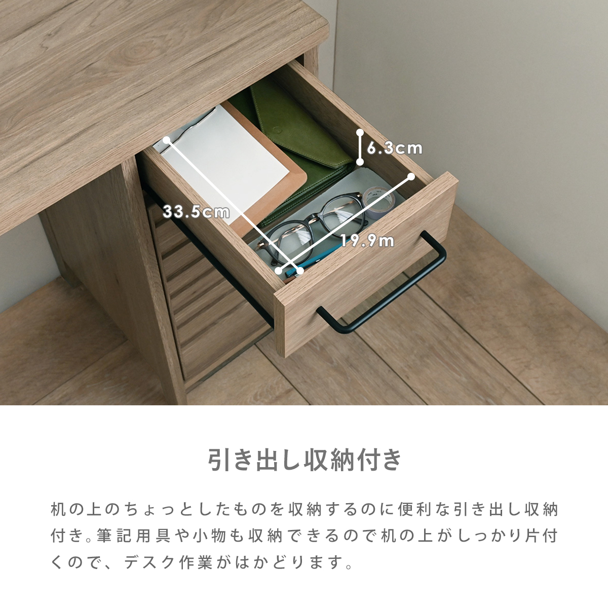 引き出しには、ノートやA4ファイル、生活小物などをまとめて収納可能。