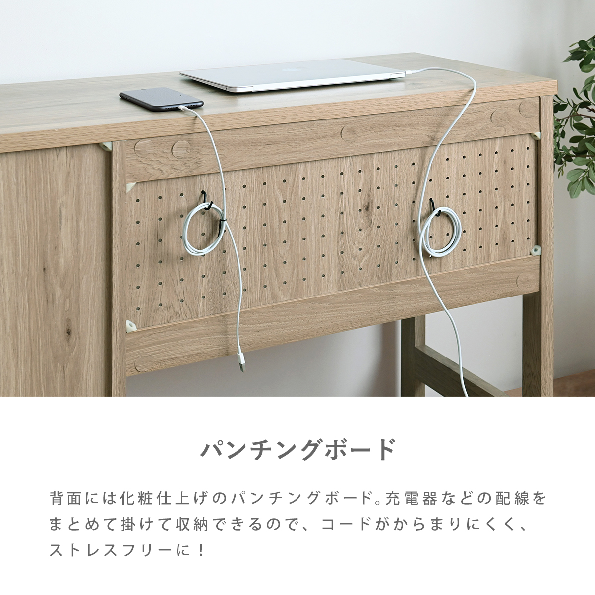 背面には化粧仕上げのパンチングボード。充電器などの配線をまとめて掛けて収納できるので、コードもすっきり。