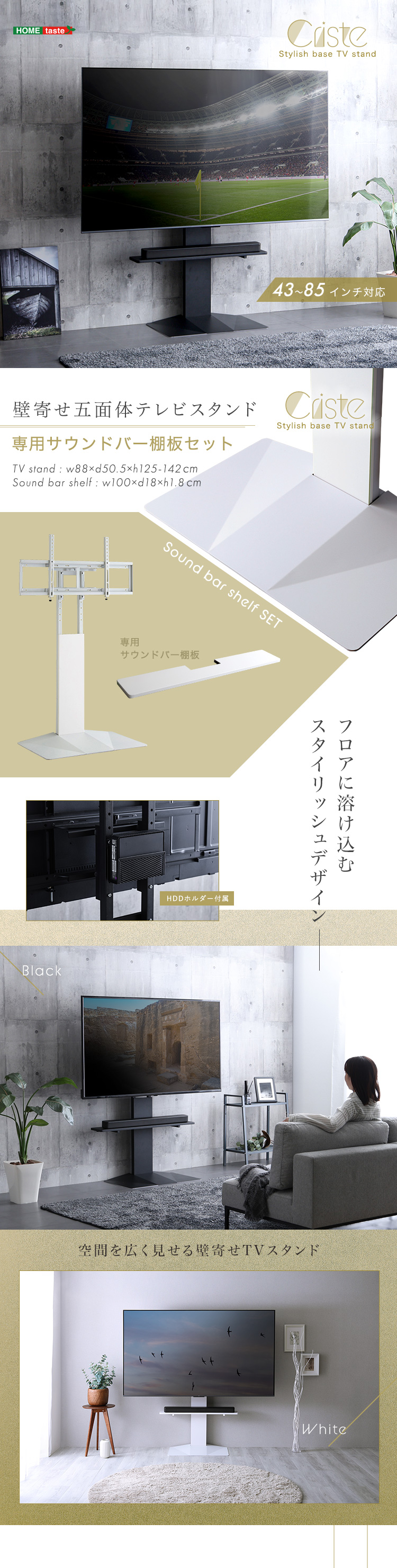 テレビスタンド 棚付き 壁寄せ 首振り サウンドバー棚板セット TVスタンド ロータイプ ハイタイプ 高さ調整 75インチ 耐震 43〜85インチ対応 ブラック ホワイト