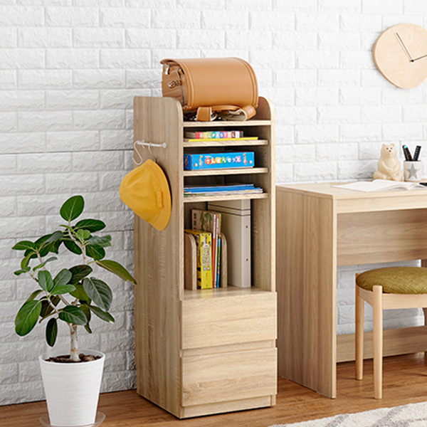 可動棚と引出し収納で教科書やプリント類、文房具なども収納可能。片付けの習慣づけに。