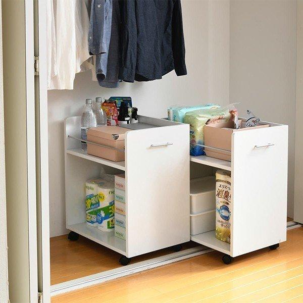 キャスター付きの便利なクローゼットラック2個組。取っ手はどちらにも取り付け可能なので、収納箇所の向きは左右入れ替えできます。幅が広いので収納場所に困る大きな日用品のストックにも最適。クローゼット内のスペースを有効活用するのでお部屋をすっきり片付けられます。