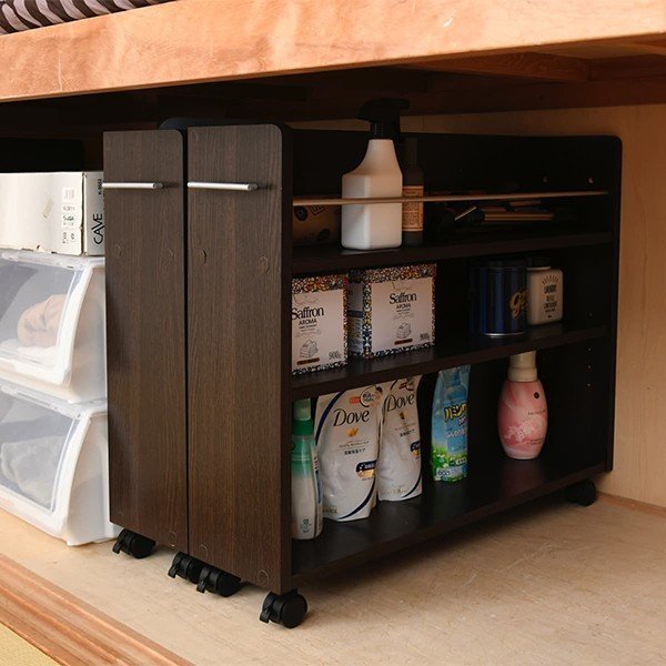 キャスター付きの便利な押入れラック2個組。取っ手はどちらにも取り付け可能なので、収納箇所の向きは左右入れ替えできます。本やメディア類や、日用品のストックなどの収納にぴったり。押入れ内のスペースを有効活用するのでお部屋をすっきり片付けられます。
