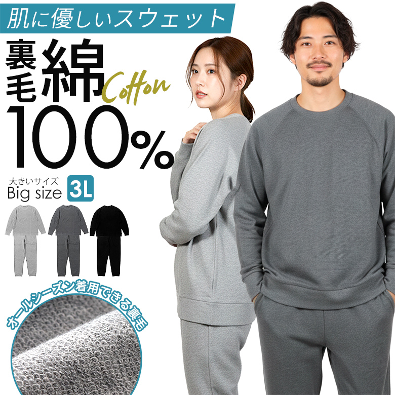 スウェット 上下 セット 綿100% セットアップ 無地 長袖 部屋着 ルームウェア メンズ レディース 大きいサイズ 黒 グレー トップス パンツ パジャマ 3L XXL