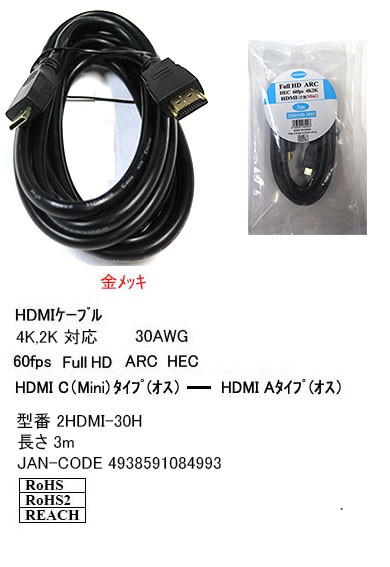 2HDMI-30H HiスピードHDMIケーブル A-C(ハーフ)タイプ 3.0m