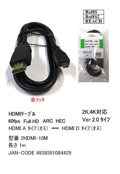 2HDMI-10M マイクロ HDMI/HDMIケーブル A-D(micro)タイプ 1m