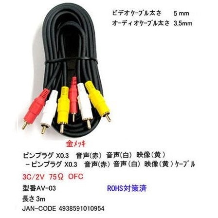 AV-03 AVケーブル RCAピンプラグx3(黄/赤/白) 3m BLK 発送