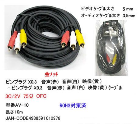 AVケーブル(映像・音声・音声) 10.0m 色:黒 RCAx3(黄/赤/白)-RCAx3(黄/赤/白)ケ−ブル 75Ω OFC 金メッキ 3C/2V