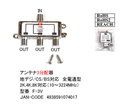 F-3V アンテナケーブル3分配器 1:3 4K8K対応(10〜3224MHz)地デジ・BS・CS 全電通型
