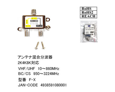 F-X アンテナ分波・混合器 4K8K対応(10〜3224MHz)地デジ・BS・CS 全電通型