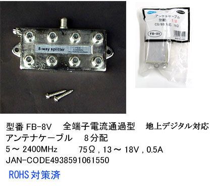FB-8V アンテナケーブル8分配器 1:8 デジタル放送対応 5〜2400MHz 75Ω