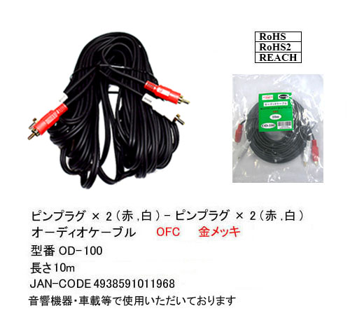 OD-100 RCAケーブル ピンプラグx2(赤・白) 10m