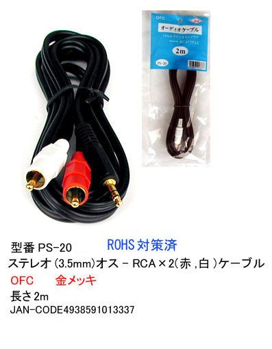 PS-20 ステレオ(3.5mm) - RCAx2(赤・白) 変換ケーブル 2m