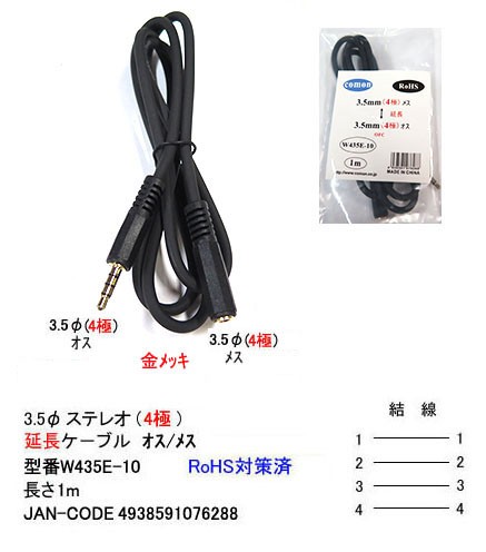 W435E-10 3.5mm 4極 延長ケーブル (メス・オス) 1.0m