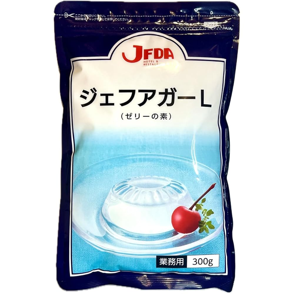 ぷるんとした食感の、海藻を主原料とする植物性ゼリーの素です。 無味無臭なので素材の風味を損ないません。 ゼリーや寄せものなどに幅広く使えます。 透明感のあるゼリーが作れます。常温で固まり、固まったゼリーは夏季の室温でも形が崩れません。 本品約20~23gで約1000~1500mlのゼリーができます。 (1)ジェフアガーLと砂糖を水気の無い容器の中で混ぜ合わせます。 (2)水の中へ、ダマにならないようにかき混ぜながら少しずつ入れます。 (3)火にかけてかき混ぜながら煮溶かし、軽く沸騰させて火を止めます。 (4)ジュースや牛乳など加え、型に流し入れ冷やし固めます。 製造所:伊那食品工業株式会社 販売者:株式会社ジェフダ 【使用上の注意】 ??果汁など酸味のあるものは、火を止めてから加えてください。 一緒に煮立てると固まらなくなることがあります。 ??ヨーグルト、乳酸飲料を加えると固まらなくなります。