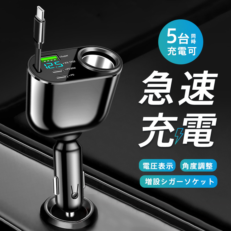 5ポート:Super(66W)+PD30W+PD+Type-C急速充電ケーブル+増設シガレット