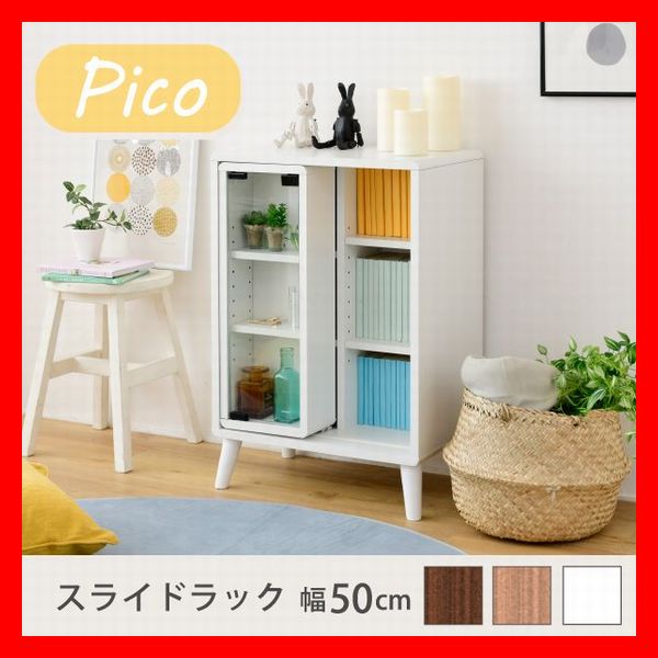 一人暮らしに寄り添う スライドラック 北欧風 コンパクト 幅50cm ガラス扉 飾り棚 本棚 背面化粧 ブラウン ナチュラル ホワイト