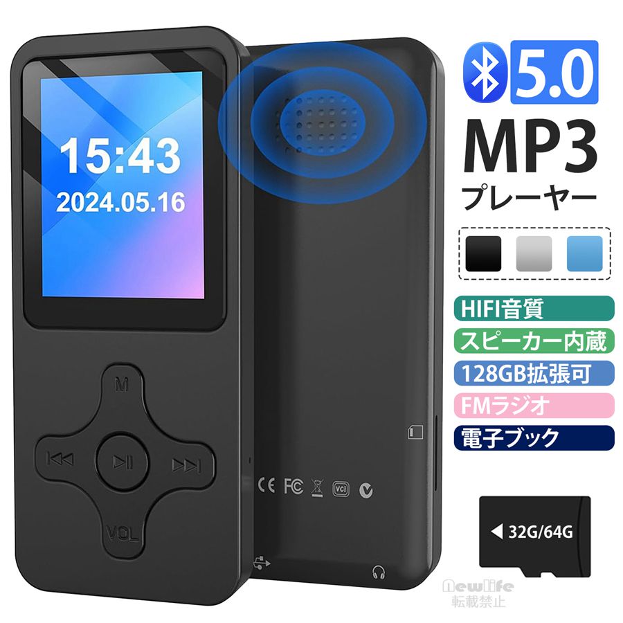 商品紹介 【Bluethteeth5.0チップ内蔵/スピーカー内蔵/3.5イヤホン】このMP3プレーヤーはアップデートされた2024最新式のBluethteeth5.0チップを採用しています。前のバージョンと比べてBluethteethのデータ伝送速度がより速いし、接続範囲も拡張されてMP3と接続の安定性と範囲が向上されます。デバイスとより迅速かつ簡単に接続することができます。MP3にはスピーカーも内蔵、クリアかつ大音量で、音質の劣化を最小限に抑えることができます。全体的な音質が大幅し、お宅・屋外どちらでも適用できます。3.5mmイヤホンジャックで有線イヤホンでも使えるし、ワイヤレスイヤホン/スピーカー/ヘッドホンもよく利用できます。(イヤホンがセットに付属していなく、PC/スマホ/車載スピーカーには非対応)