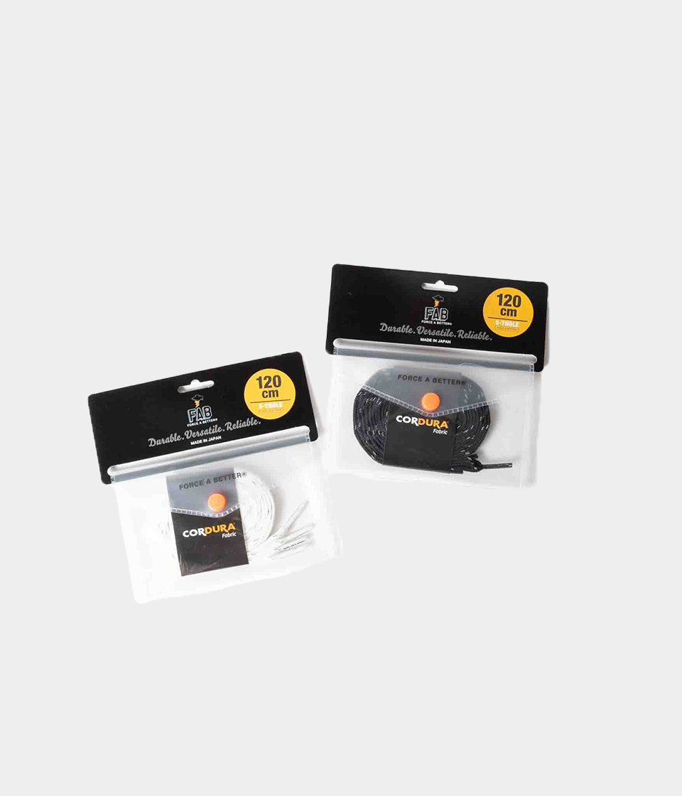 シューレス先端のチップ(アグレット)に入るCORDURA ロゴ、FAORCE A BETTER ロゴはお気にりのスニーカーをさりげなく演出。 サイズは80cm(4-5ホール)、120cm(5-7ホール)の2サイズ展開です。