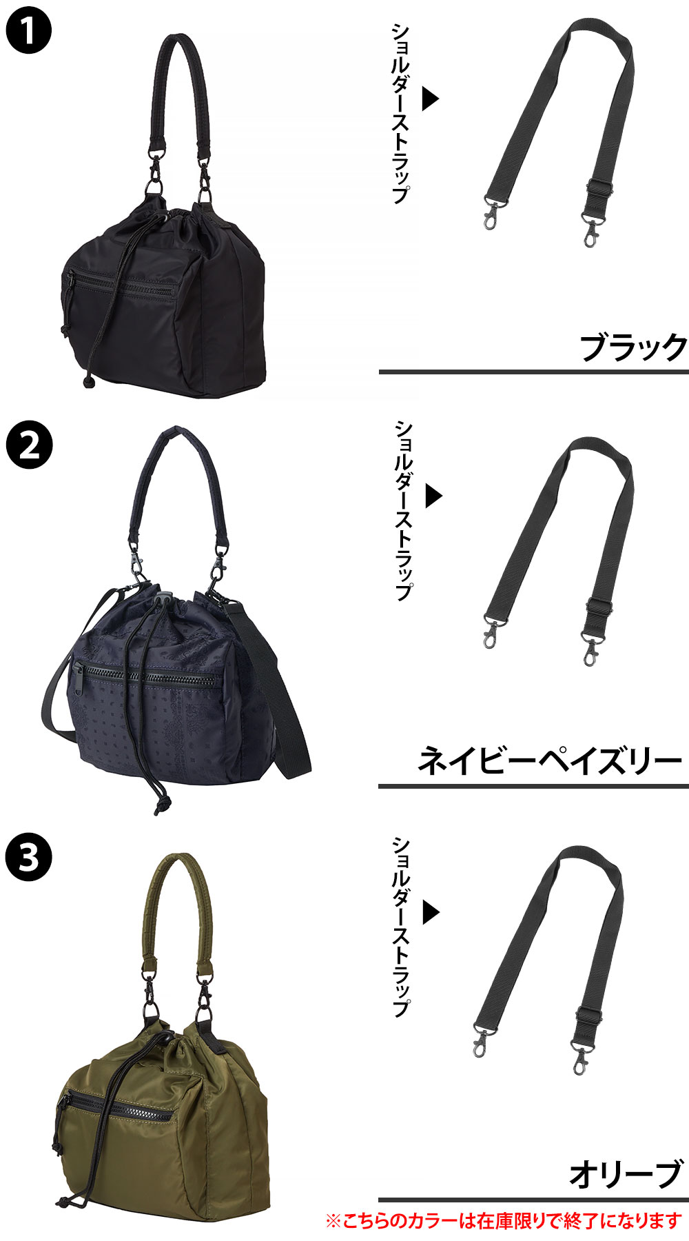 | カラー | 1.ブラック(-14392362) 2.ネイビーペイズリー(-14750989) 3.オリーブ(-14392363) | ||