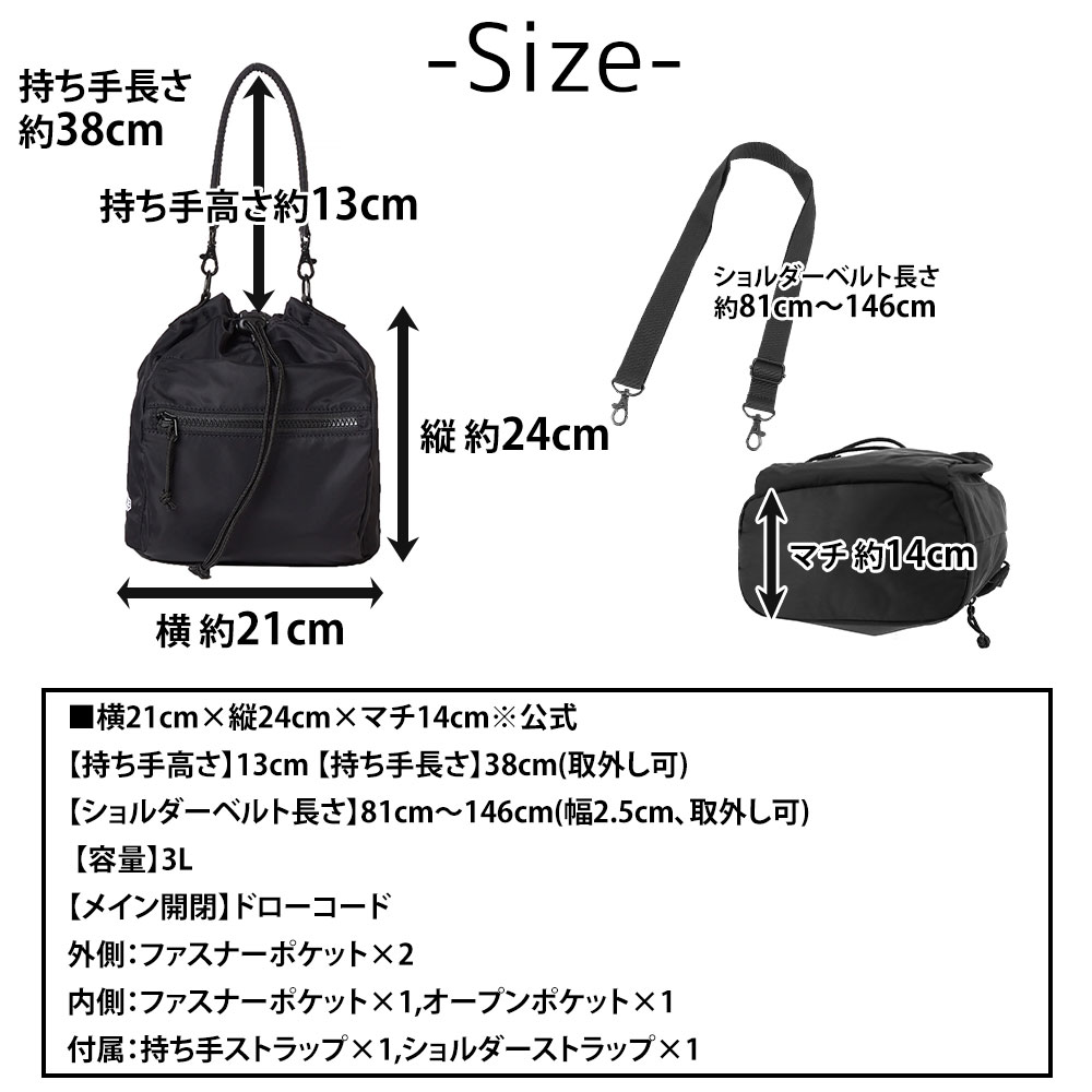 | サイズ(約) ※当店実寸値 | 公式サイズ 横21cm×縦24cm×マチ14cm 【持ち手高さ】13cm 【持ち手長さ】38cm(取外し可) 【ショルダーベルト長さ】81cm〜146cm(幅2.5cm、取外し可) 【容量】3L | ||