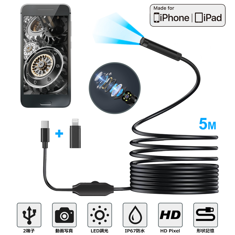 ファイバースコープ HD 内視鏡カメラ USB-C Lightning 接続 8.0mm 高画素 極細レンズ LED ライト 調光 形状記憶 ケーブル スマホ PC iPhone iPad iOS Android
