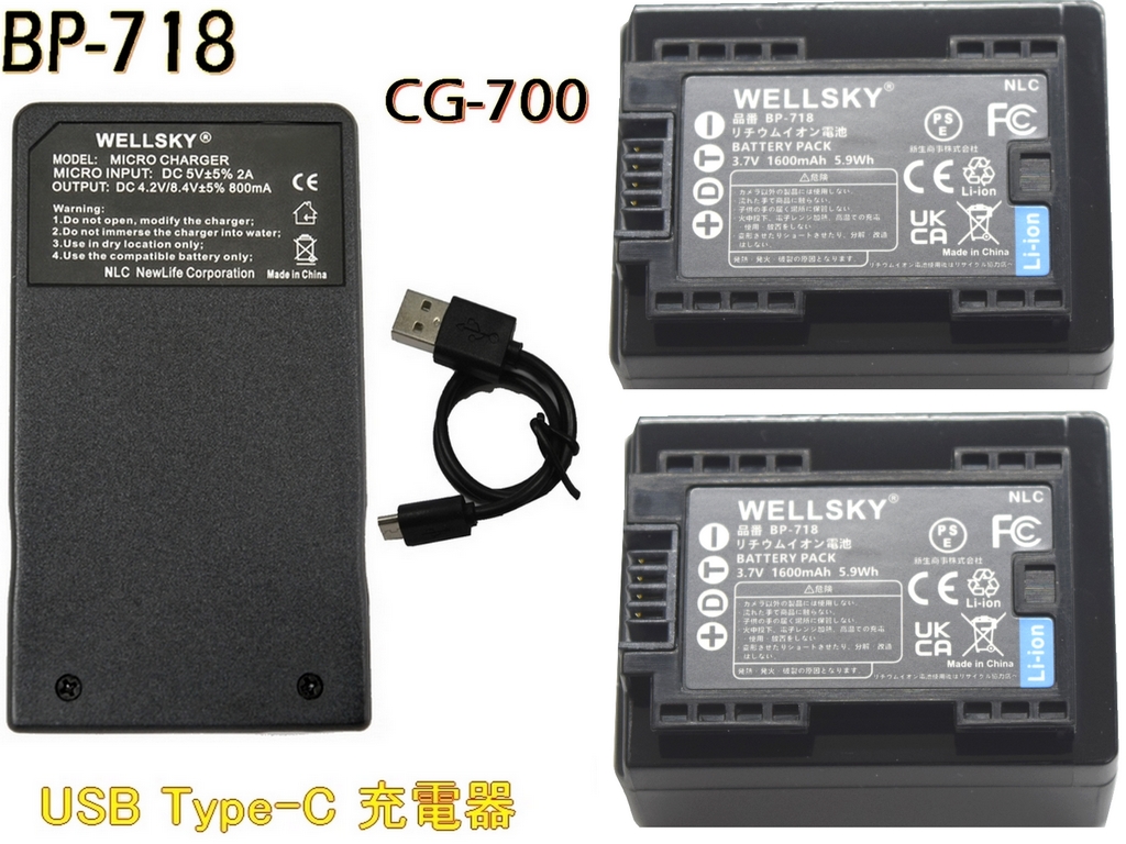 BP-718 BP-709 互換バッテリー 2個 + 超軽量 USB Type C バッテリーチャージャー 互換充電器 CG-700 1個 [ 3個セット ] Canon キヤノン