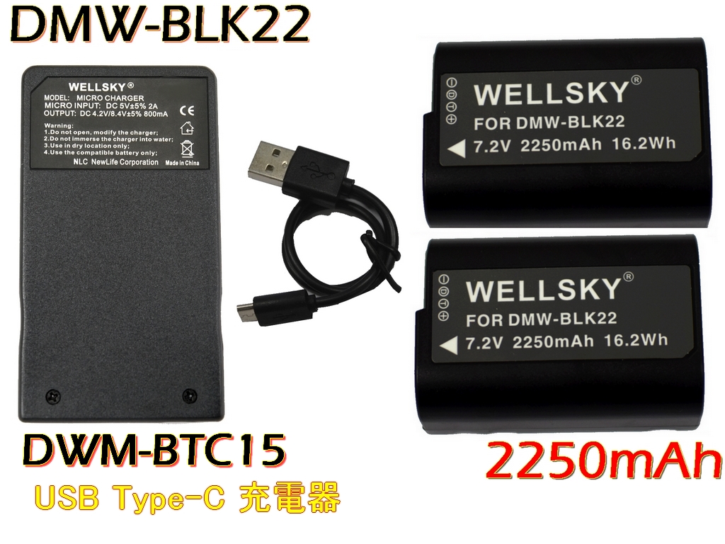 DMW-BLK22 互換バッテリー 2250mAh 2個 + DMW-BTC15 [ 超軽量 ] USB 急速 互換充電器 バッテリーチャージャー 1個 Panasonic パナソニック